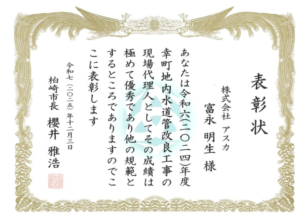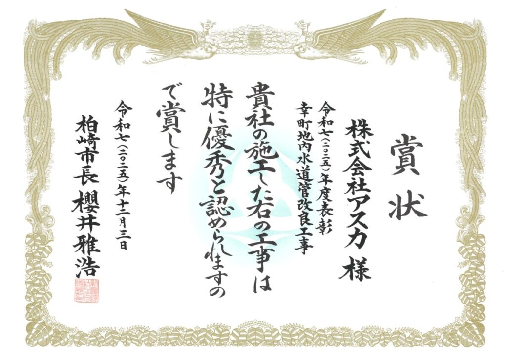 このたび、弊社が施工いたしました、「水建改第2号 幸町地内水道管改良工事」が、発注者である柏崎市様より、令和7年度優良建設工事表彰を受賞いたしました。