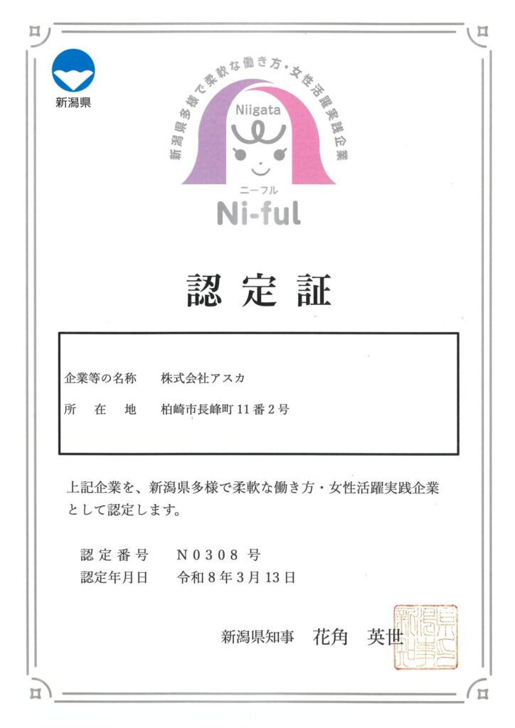 弊社は、新潟県が推進する「多様で柔軟な働き方・女性活躍実践企業認定制度」において、Ni-ful 認定を取得しました。